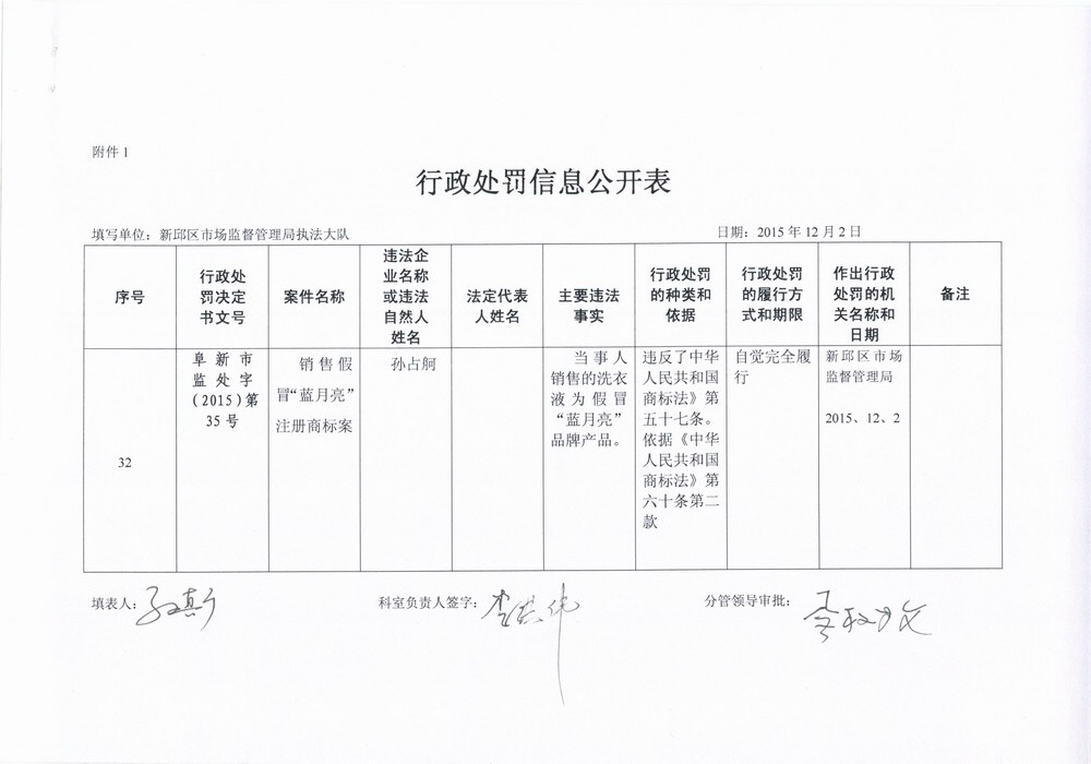 关于孙占舸销售假冒“蓝月亮”注册商标行政处罚信息表